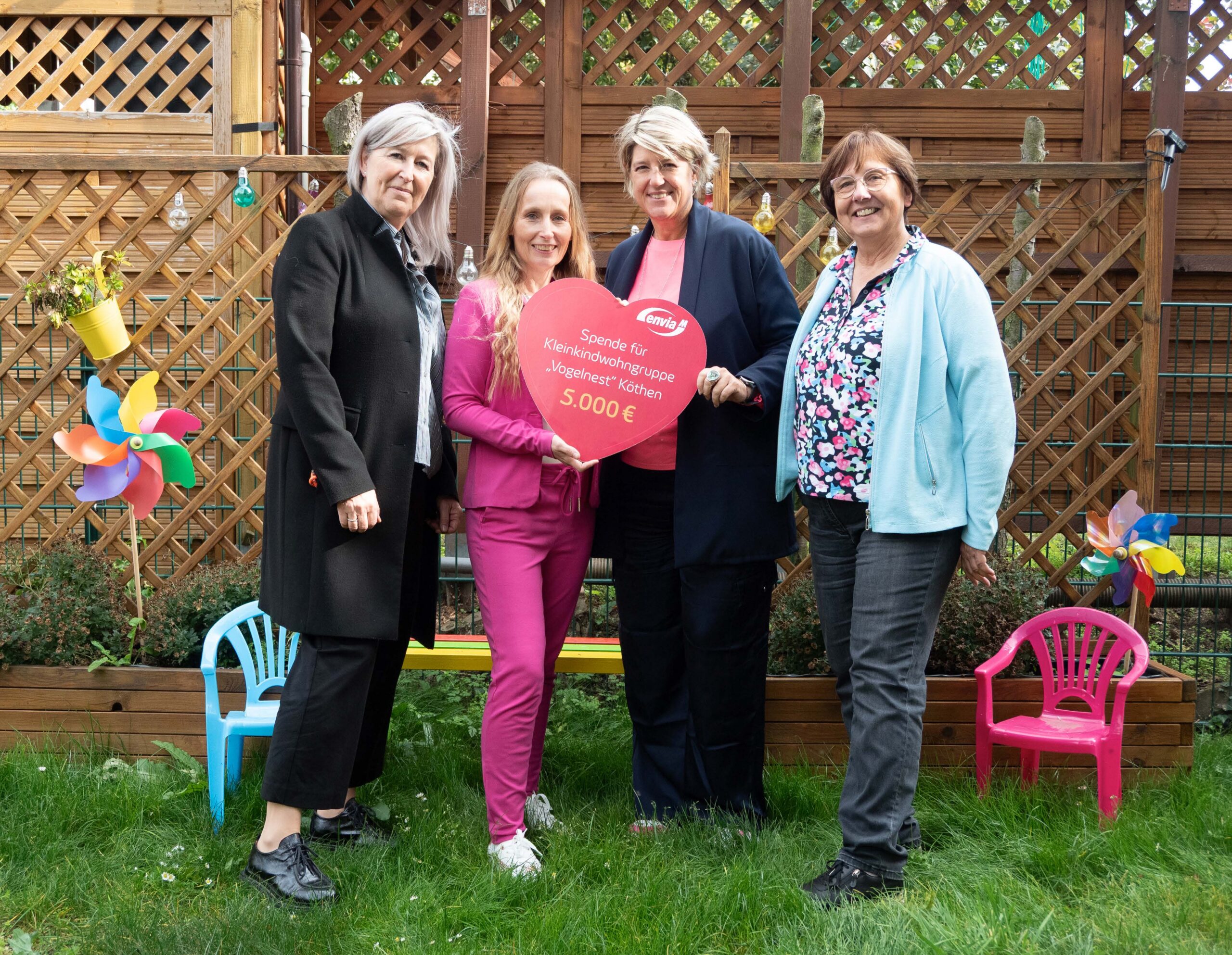 Viel Herz für die Kleinsten im “Vogelnest“ Köthen #Inka Schäfer (enviaM) Mandy Bode, Sigrid Nagl (emviaM) und #Prokusristin Annette Schermuck bei der Spendenübergabe (v.l.n.r.)